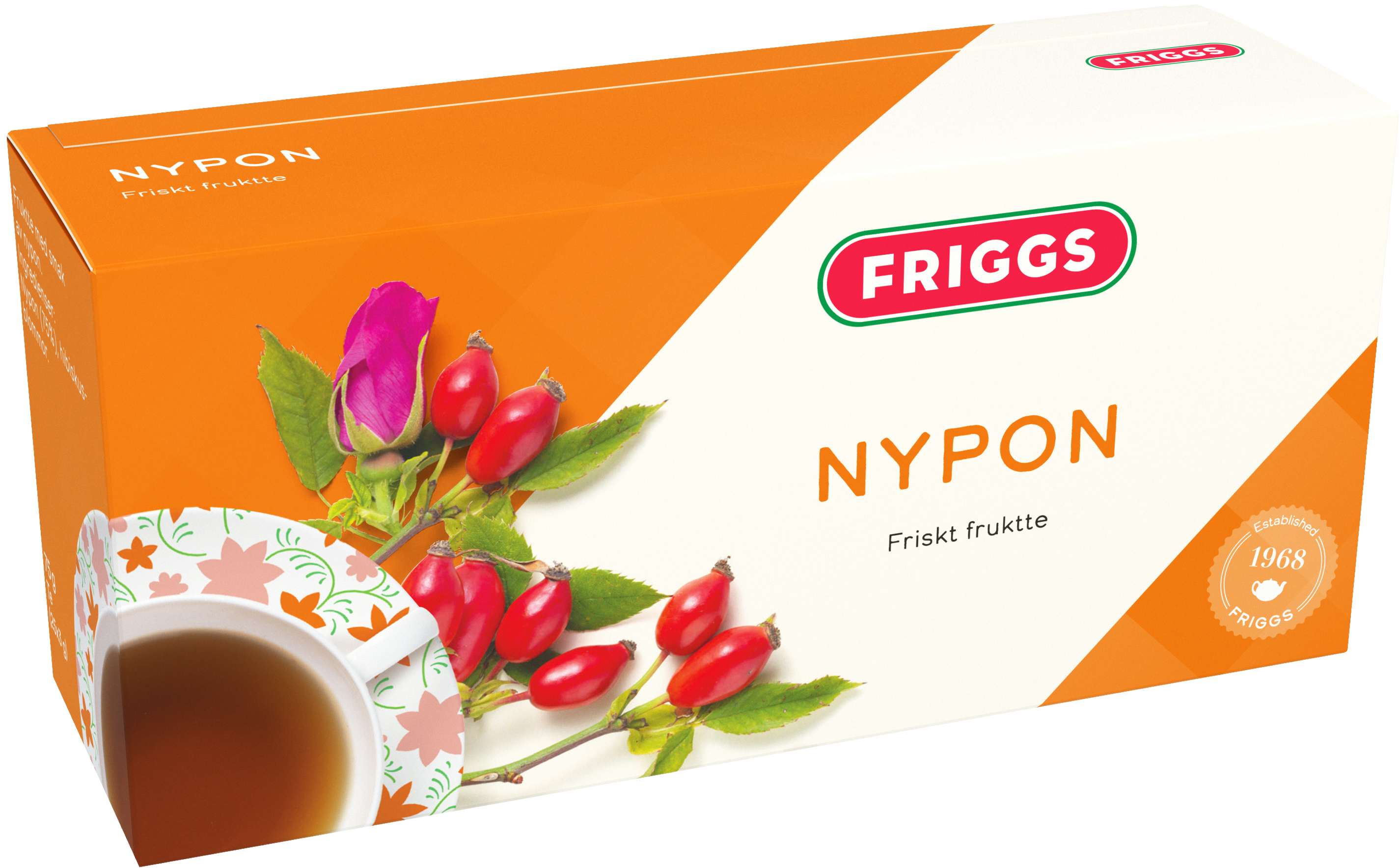 Friggs Nypon Te är ett örtte gjort på nypon och hibiskusblommor som ger teet syrligt god smak. Friggs nyponte är naturligt koffeinfritt och passar att dricka även på kvällen.