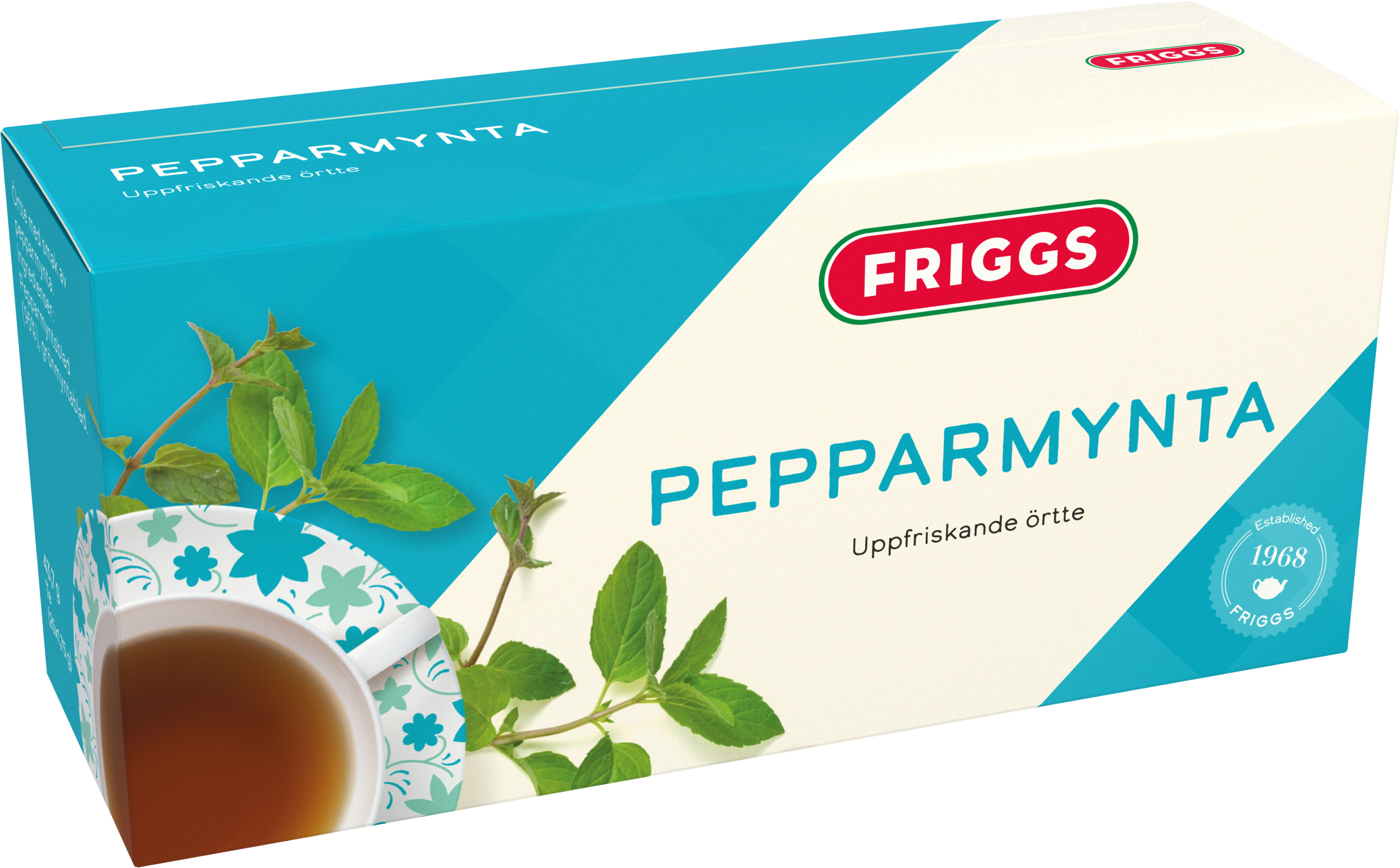 Friggs Pepparmynta Te är ett naturligt örtte med uppfriskande smak av pepparmyntsblad. Pepparmynta är naturligt koffeinfritt och passar bra att dricka på kvällen.