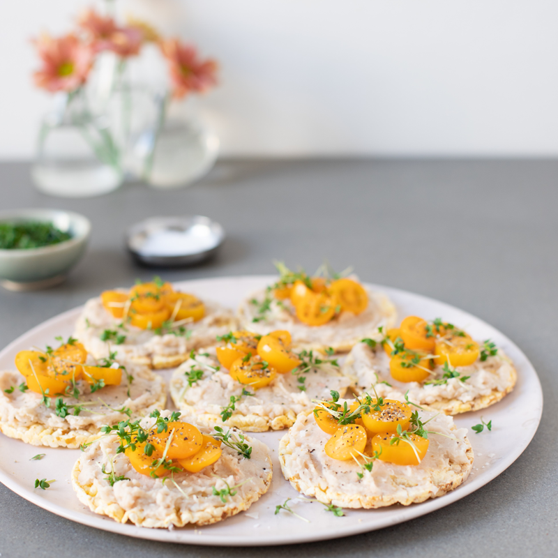 2. Bre ut ca 1 msk bönröra på majskakorna och toppa med tomat och smörgåskrasse. Kan även toppas med ytterligare valfritt protein.