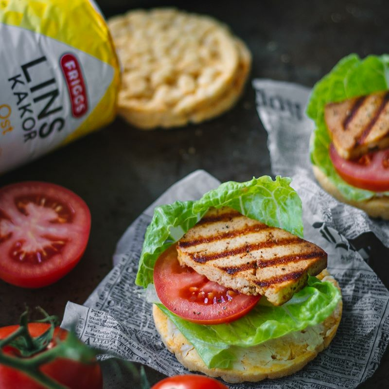 Bre på lite färskost eller majonnäs på linskakorna, lägg på en tomatskiva och en skiva grillad tofu.